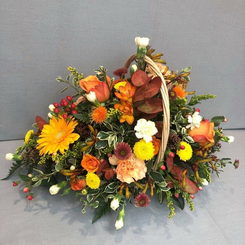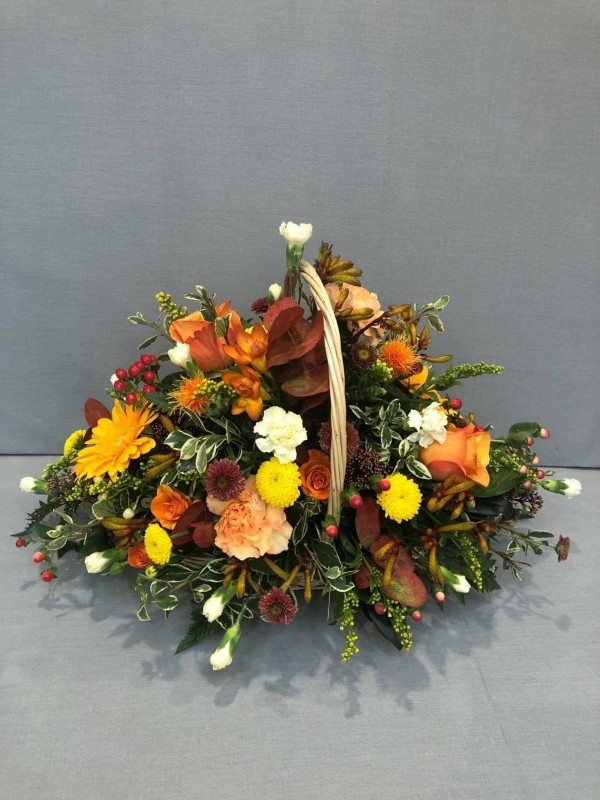 Luxury Autumn basket including orange roses, solidaster, orange carthamus, red hypericum, cream spray carnations, gold carnations, yellow chrysanthemums, orange spray roses, red freesia, mixed foliage and gold gerbera.