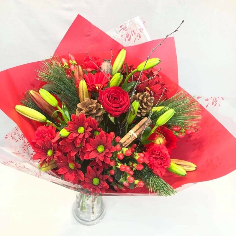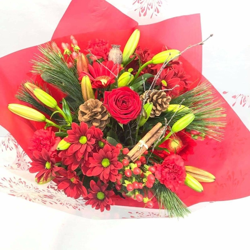 A traditional Christmas hand-tied including red lilies, red chrysanthemums, red hypericum, a red rose, red gerbera, red carnations, Christmas pine, brown comes and twigs. This design comes pre-arranged ready to place into a vase. Vase not included.