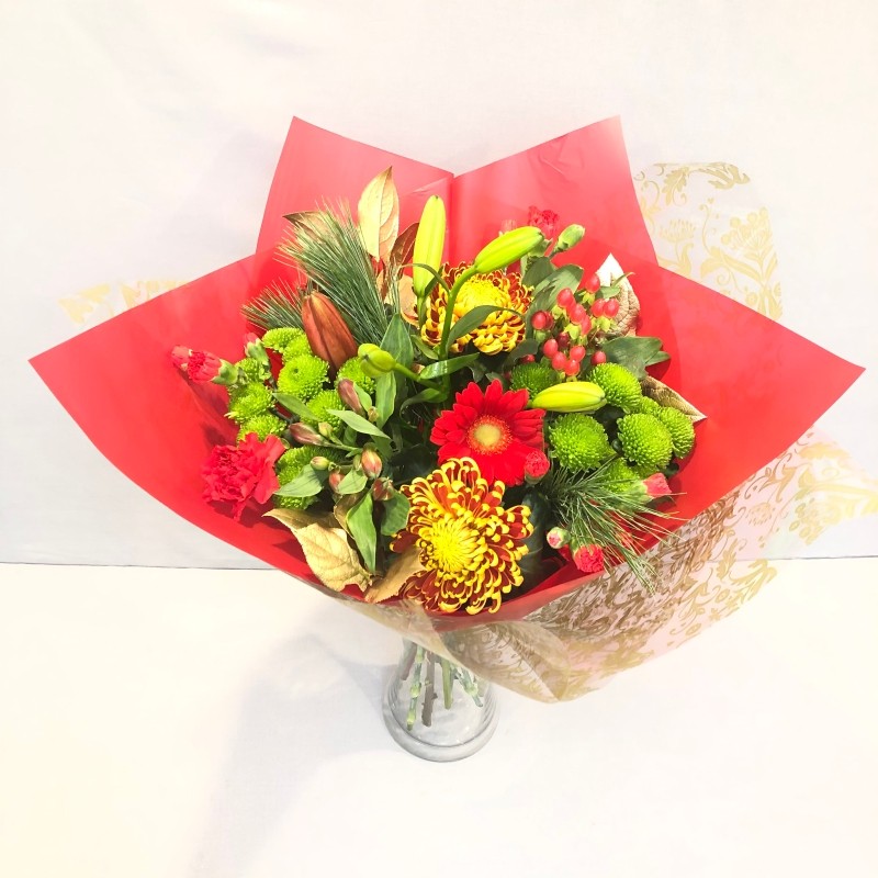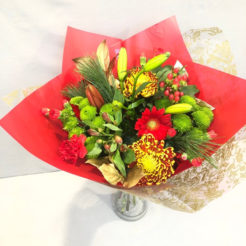 Red, gold and green hand-tied including red gerbera, gold salal, a red lily, a gold bloom chrysanthemum, green chrysanthemums, Christmas pine, red alstroemeria and red spray carnations. This design comes pre-arranged ready to place into a vase. Vase not included.