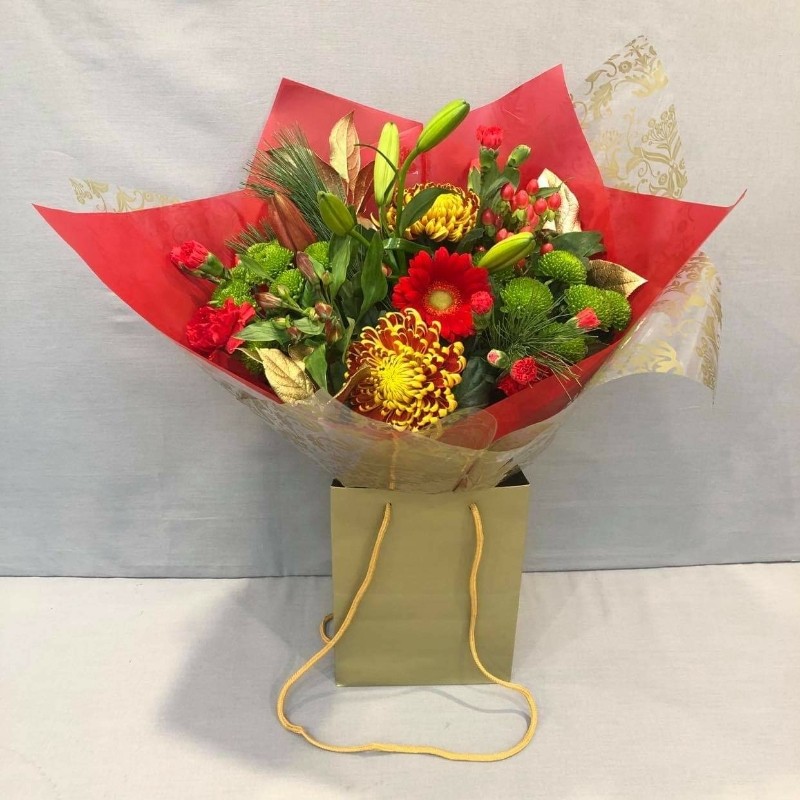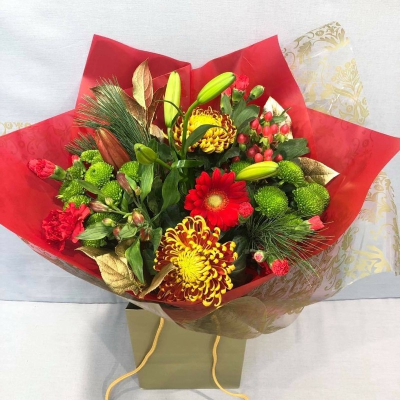 A red, gold and green aqua-pack including bronze bloom chrysanthemum, red gerbera, gold salal, a red lily, Christmas pine, red alstroemeria and red spray carnations. This design comes arranged in a bubble of water and box.