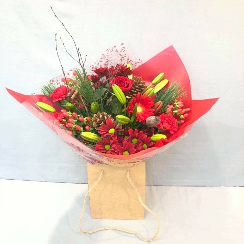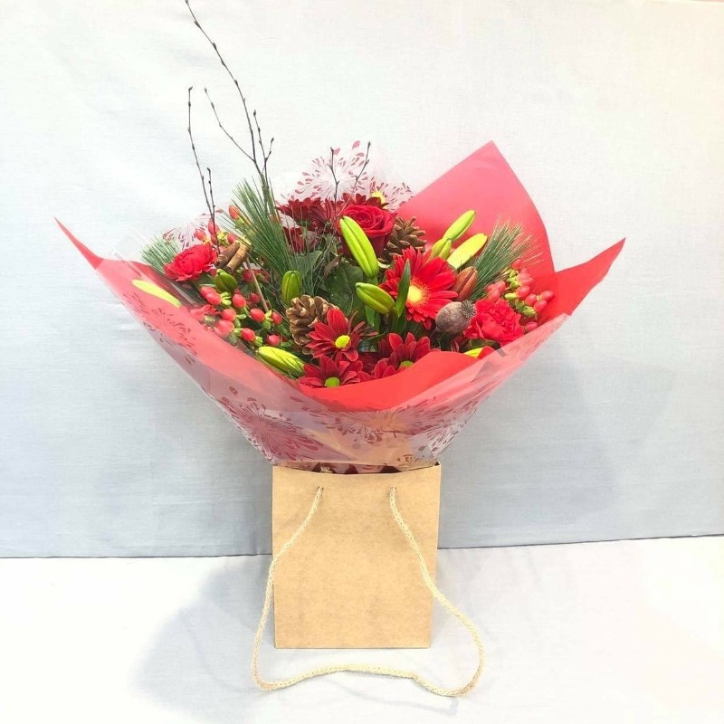 A red aqua-pack including red chrysanthemums, Christmas pine, red gerbera, red hypericum, red spray carnations, red lilies, brown cones, twigs and a red rose. This design comes pre-arranged in a bubble of water and box.