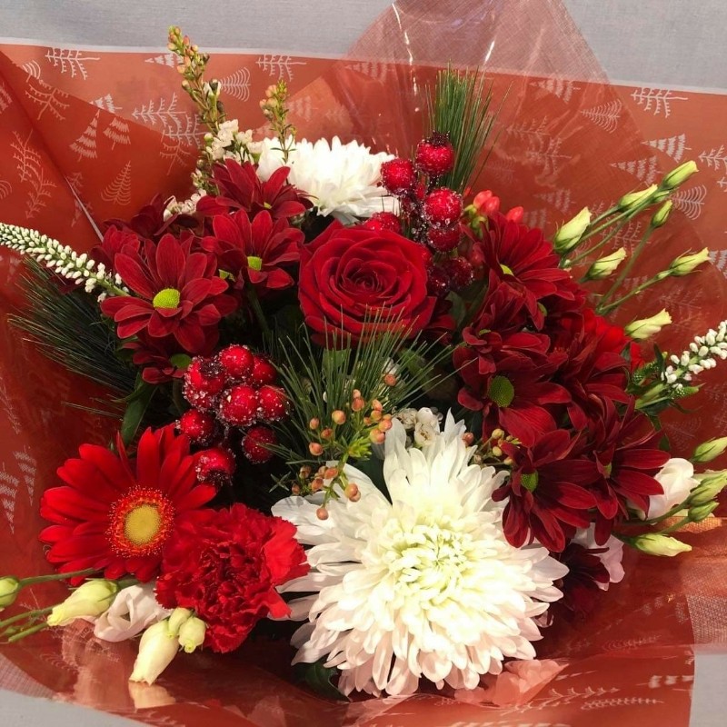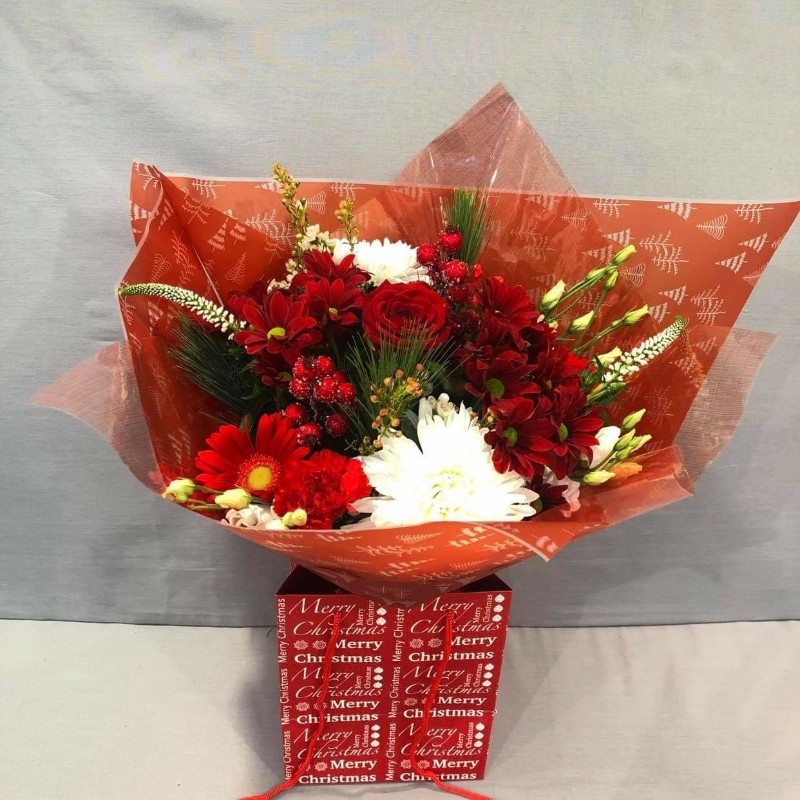 Red and white aqua-pack including a white bloom chrysanthemum, red berries, white wax flower, red gerbera, white lissianthus, a red rose, red chrysanthemums, white veronica, red carnations and Christmas pine. This design comes pre-arranged in a bubble of water and box.