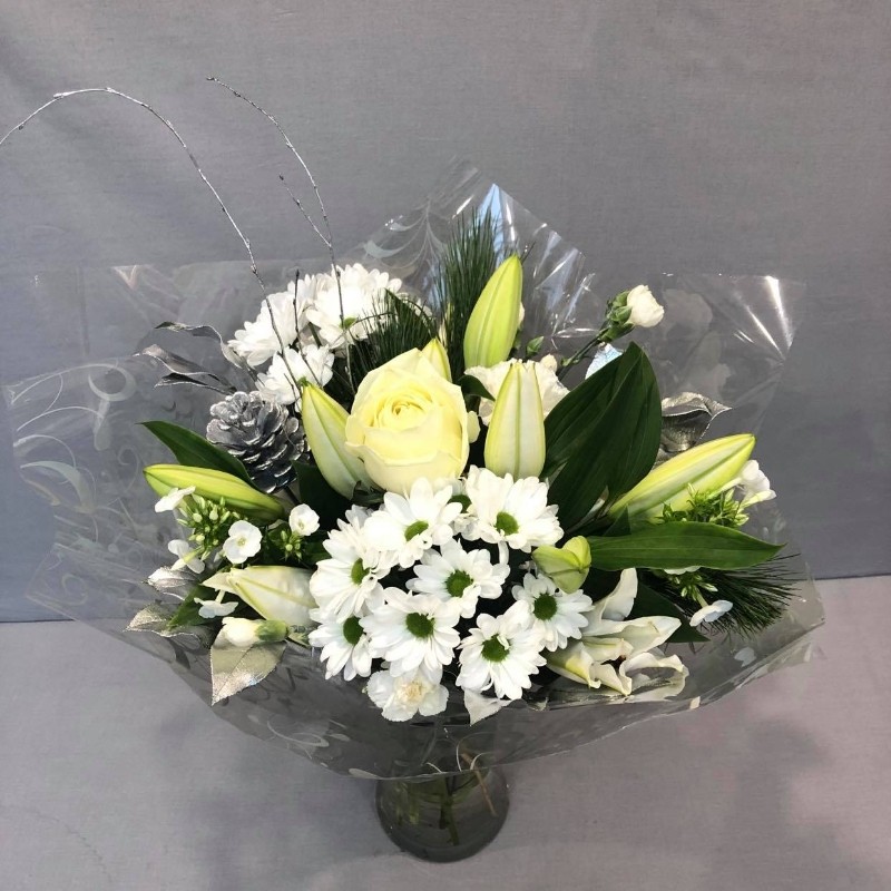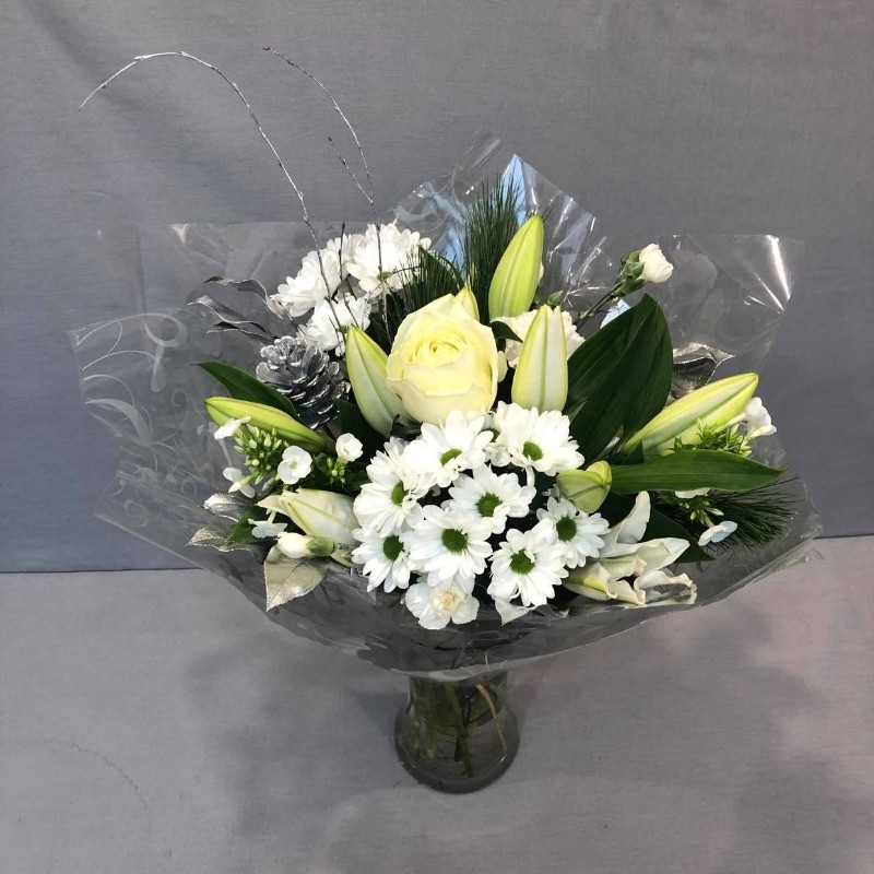 White and silver hand-tied including white chrysanthemums, white oriental lilies, a white rose, silver cone and twigs, white spray carnations, a white carnation, white phlox and Christmas pine. This design comes pre-arranged ready to place into a vase. Vase not included.