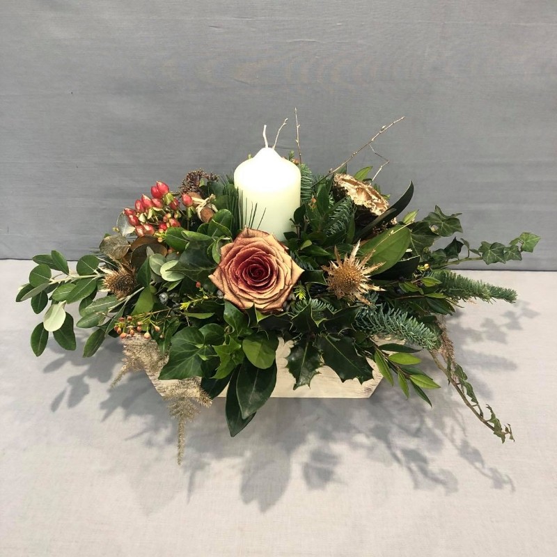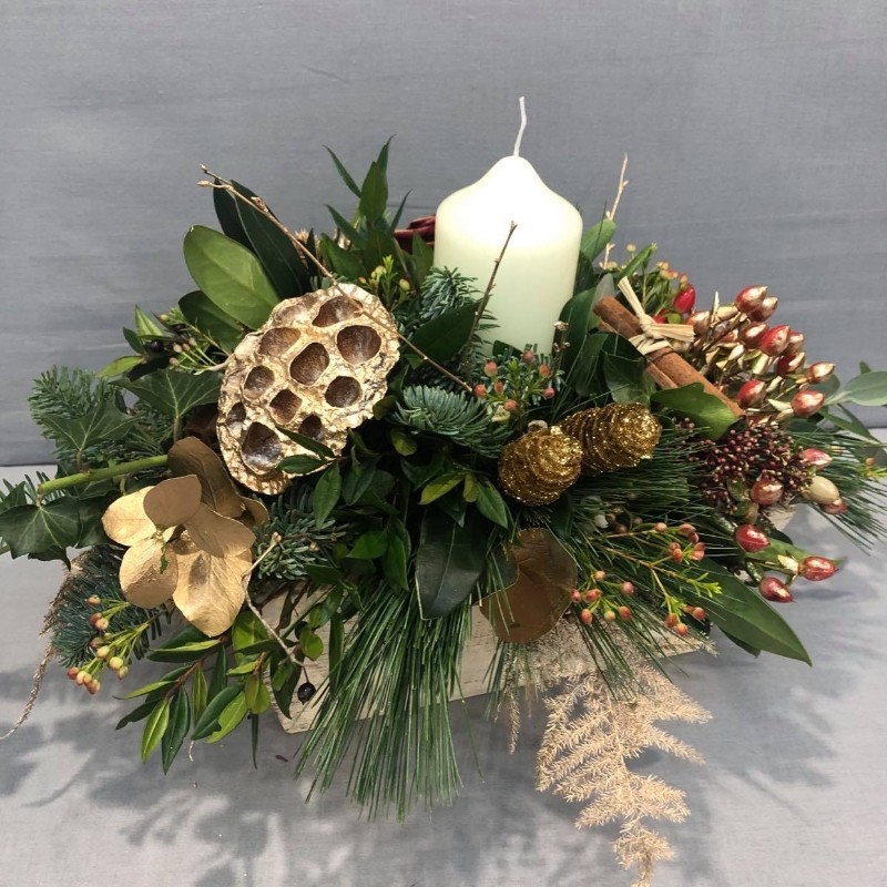 A red and gold table arrangement in a rustic cream pot. This design includes a vintage red rose, Christmas pine, gold erngium, red vintage hypericum, wax flower, gold ming, a gold lotus head, glittery gold cones, cinnamon, gold twigs, and mixed foliage. This is perfect as a table arrangement for a rectangle table or to decorate a sideboard.