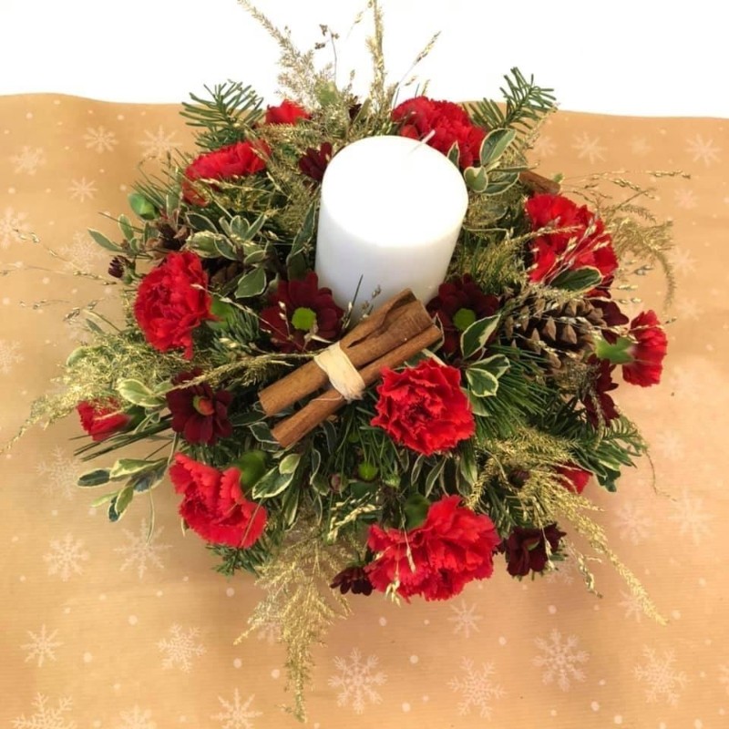 A Christmas arrangement in red and gold including cinnamon, Christmas pine, brown cones, red spray carnations, red chrysanthemums, gold ming, red carnations and mixed foliage. This design is perfect as a table arrangement for a round table.