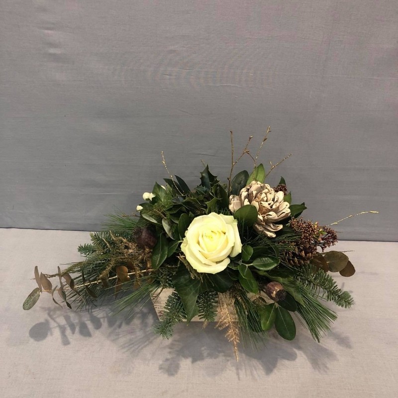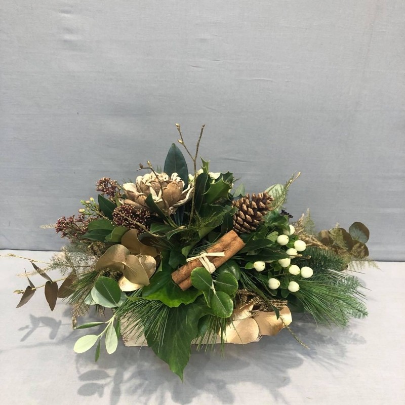 A white, brown and gold natural table decoration including Christmas pine, mixed foliage, a white rose, gold ming, brown cones, gold twigs, red skimmia, white hypericum, cinnamon, holly and a beauty rose. This design is perfect for a retangle table or a sideboard.